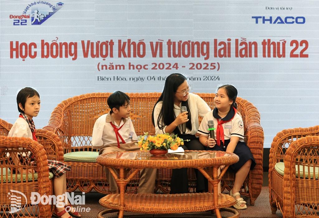 | 3 em học sinh có hoàn cảnh đặc biệt khó khăn giao lưu chia sẻ tinh thần vượt khó của mình tại buổi lễ trao học bổng. |