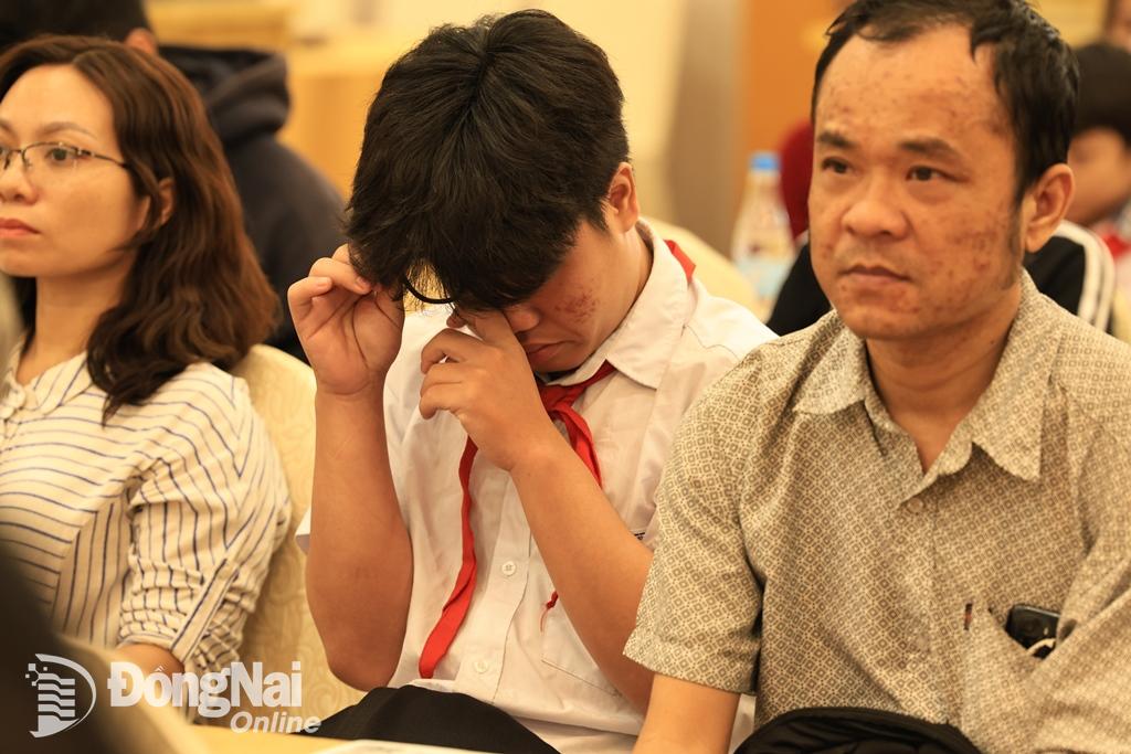 | Em Hoàng Văn Mai, học sinh lớp 9/1 Trường trung học cơ sở Trảng Dài (thành phố Biên Hòa) xúc động khi nghe chia sẻ của nhiều bạn còn khó khăn hơn mình. |