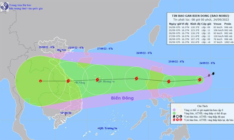 Theo Trung tâm Dự báo Khí tượng Thủy văn quốc gia, hồi 7 giờ ngày 24/9, vị trí tâm bão ở cách đảo Luzon (Philippines) khoảng 710km về phía đông. Sức gió mạnh nhất vùng gần tâm bão mạnh cấp 9 (75-88km/giờ), giật cấp 11.