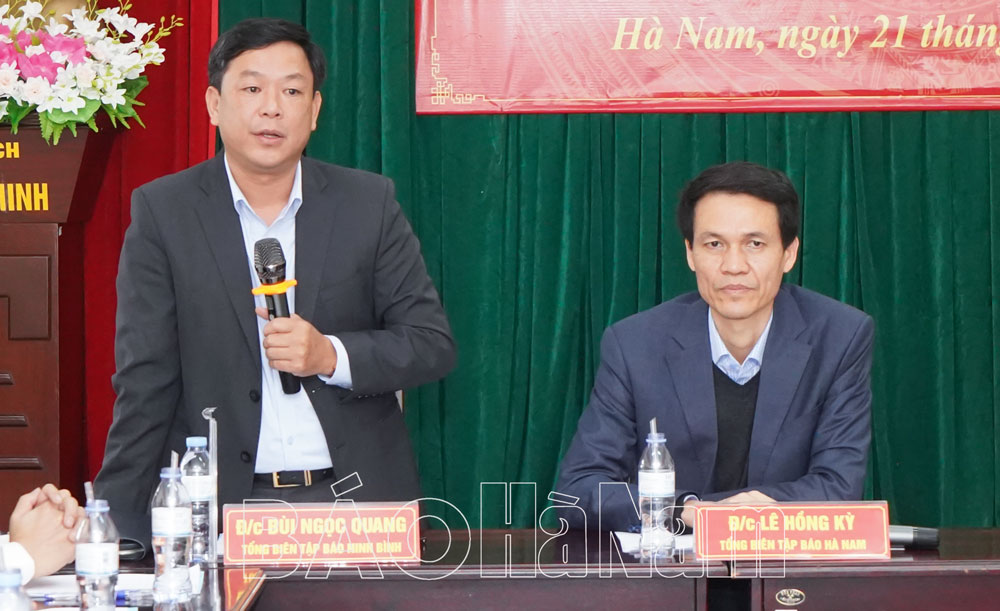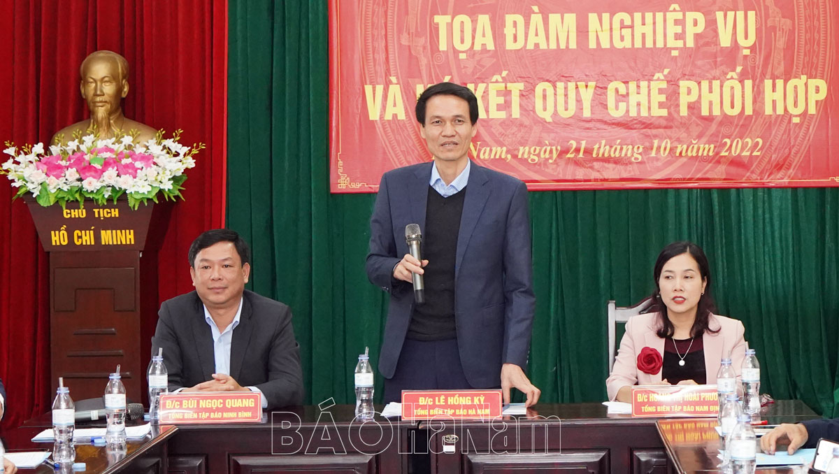 Nhân dịp này, lãnh đạo 3 cơ quan Báo Hà Nam, Nam Định và Ninh Bình đã thông qua Quy chế phối hợp về hoạt động nghiệp vụ của 3 đơn vị giai đoạn 2022-2025. Ký kết Quy chế phối hợp, lãnh đạo 3 cơ quan Báo Hà Nam, Nam Định và Ninh Bình mong muốn thực hiện có hiệu quả nữa Nghị quyết số 35-NQ/TW của Bộ Chính trị khóa XII "Về tăng cường bảo vệ nền tảng tư tưởng của Đảng, đấu tranh phản bác các quan điểm sai trái, thù địch trong tình hình mới"; Nghị quyết Đại hội lần thứ XIII của Đảng về "Xây dựng nền báo chí, truyền thông chuyên nghiệp, nhân nhân văn và hiện đại"; nâng cao ý thức, trách nhiệm, kỹ năng nghiệp vụ của đội ngũ những người làm báo Đảng địa phương; tạo điều kiện để cán bộ, phóng viên, viên chức, người lao động 3 cơ quan được giao lưu, học hỏi, trao đổi kinh nghiệm, kỹ năng nghiệp vụ để làm tốt hơn nhiệm vụ thông tin tuyên truyền mà Đảng bộ, chính quyền và nhân dân giao cho.