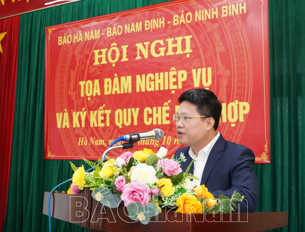 Dự, chủ trì hội nghị có các đồng chí: Lê Hồng Kỳ - TUV, Tổng Biên tập Báo Hà Nam; Hoàng Thị Hoài Phương – TUV, Tổng Biên tập Báo Nam Định; Bùi Ngọc Quang – TUV, Tổng Biên tập Báo Ninh Bình, cùng đông đảo các đồng chí cán bộ, phóng viên, biên tập viên, nhân viên của 3 đơn vị.