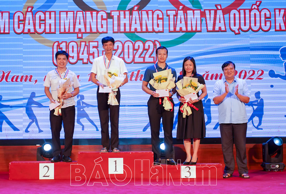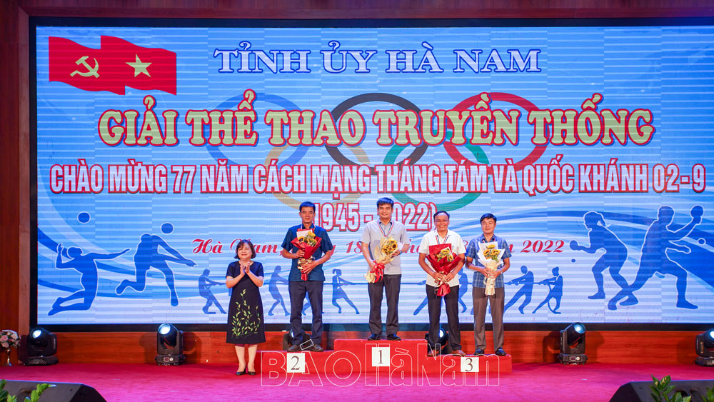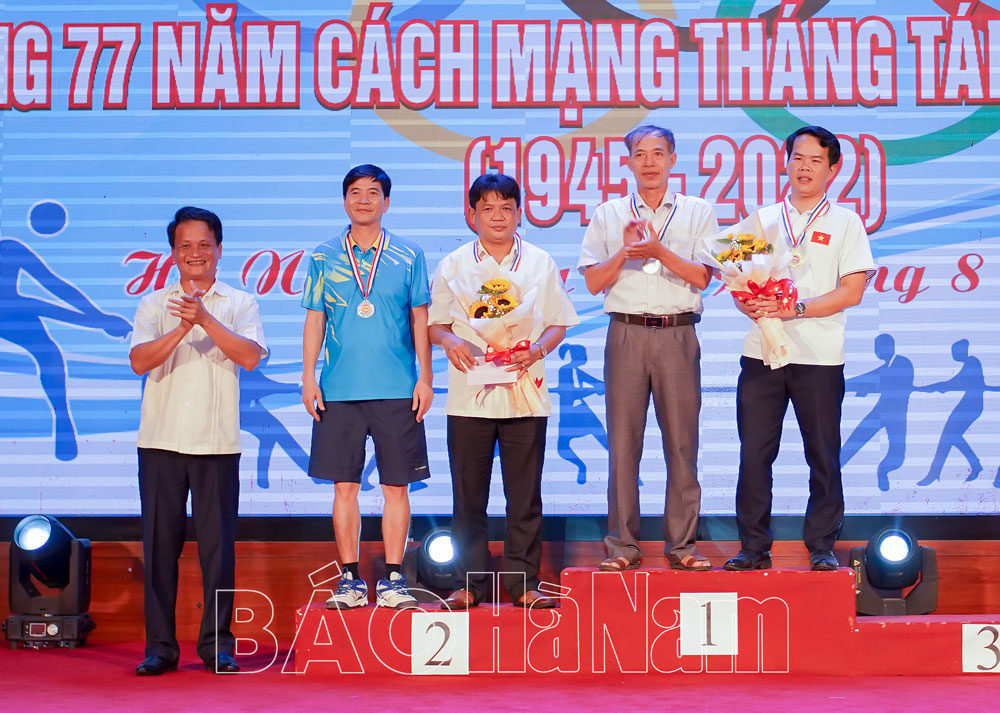 Dựa theo điểm thành tích của các vận động viên ở các nội dung thi đấu, Ban tổ chức đã trao giải Nhất toàn đoàn cho Đội Văn phòng Tỉnh ủy; giải Nhì: Đội Ban Nội chính Tỉnh ủy; giải Ba: Đội Ban Tuyên giáo Tỉnh ủy; giải Tư: Đội Báo Hà Nam.