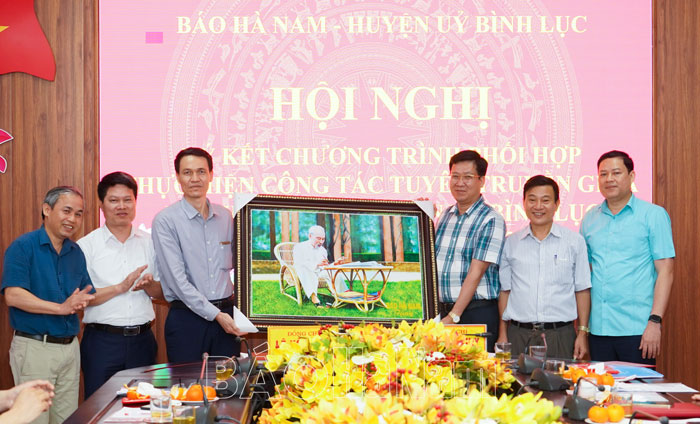 Đồng chí Nguyễn Thế Vĩnh, Trưởng phòng Xây dựng Đảng - Nội chính Báo Hà Nam phát biểu tại hội nghịĐồng chí Trần Xuân Dũng, Phó Bí thư Huyện ủy, Chủ tịch UBND huyện Bình Lục phát biểu tại hội nghịBáo Hà Nam tặng tranh lưu niệm cho Huyện ủy Bình Lục
