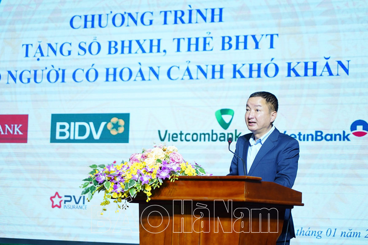 Giám đốc BHXH tỉnh Trần Mạnh Toàn phát biểu cảm ơn sự quan tâm của lãnh đạo BHXH Việt Nam và các nhà tài trợ trong việc hỗ trợ tặng sổ BHXH, thẻ BHYT cho người có hoàn cảnh khó khăn, góp phần mở rộng lưới an sinh trên địa bàn tỉnh.