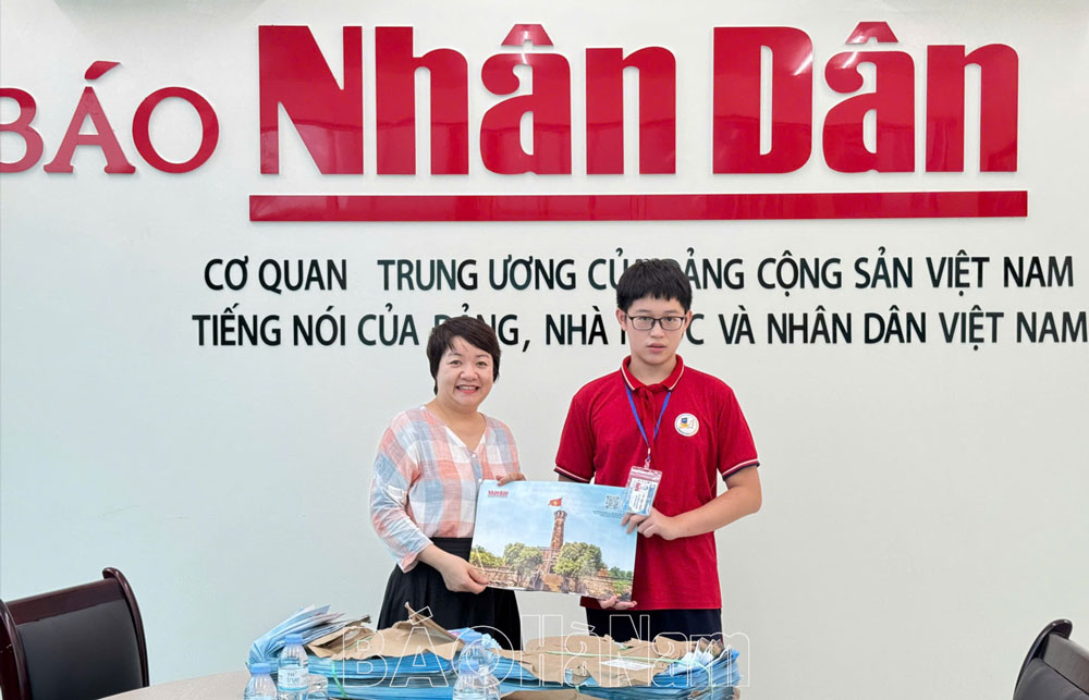 Văn phòng Đại diện Báo Nhân Dân tại Hà Nam trao tặng ấn phẩm đặc biệt "Cột cờ Hà Nội" cho cô và trò Trường THCS Nguyễn Tất Thành.
