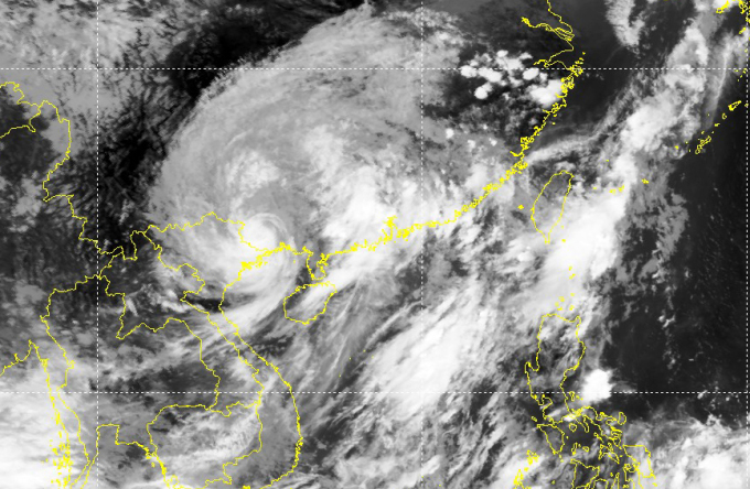 Tâm bão (xoáy tròn màu trắng đậm) đang áp sát biên giới Việt - Trung, trưa 18/7. Ảnh vệ tinh: NHCMF
