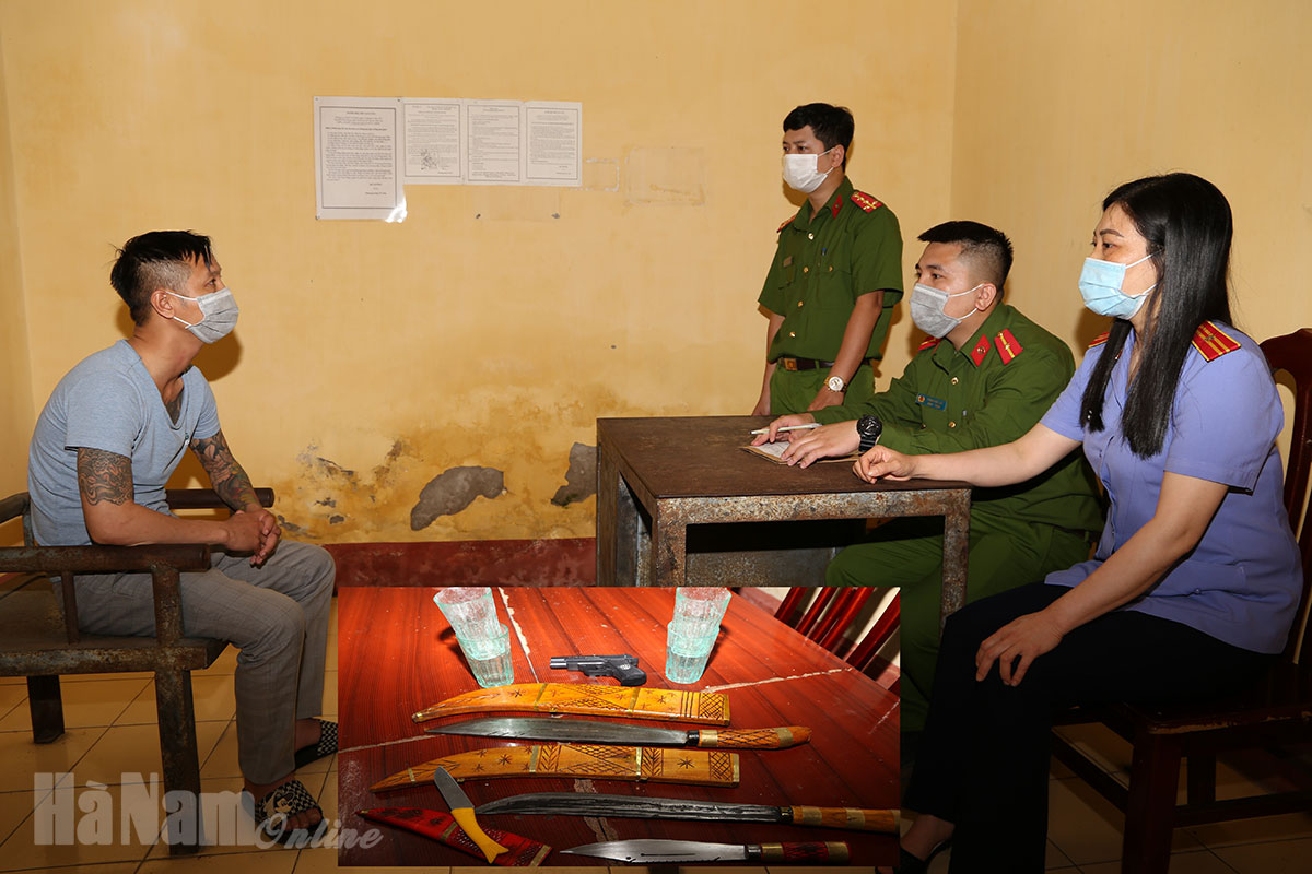 Công an thị xã Duy Tiên lấy lời khai đối tượng Vượng và các tang vật thu giữ.