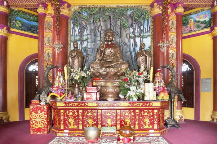 Chùa Bình A còn được gọi là Phúc Khánh Tự. Chùa này có một ngôi tượng Phật A Di Đà làm bằng đá xanh, cao khoảng 32 mét và nặng gần 3000 tấn. Đây được xem là ngôi tượng Phật A Di Đà bằng đá xanh đạt kỷ lục lớn nhất Việt Nam. Chùa được bao bọc bởi cánh đồng lúa xanh mướt, kế bên là dòng sông Đào êm đềm.