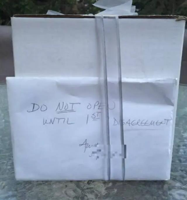 Món quà có chỉ dẫn hết sức cụ thể, yêu cầu cặp đôi mới cưới không được mở ra cho đến lần bất đồng ý kiến đầu tiên. Cặp đôi tiếp tục cuộc sống của họ và món quà đã bị lãng quên trong nhiều năm.