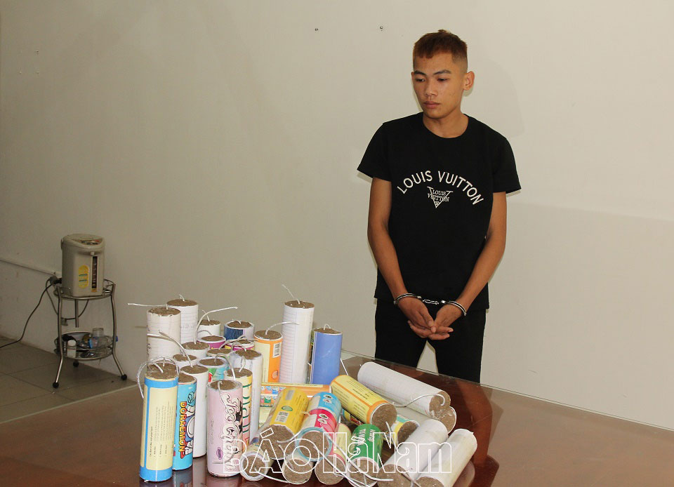 Đối tượng Nguyễn Tùng Dương và số pháo nổ tại cơ quan công an.