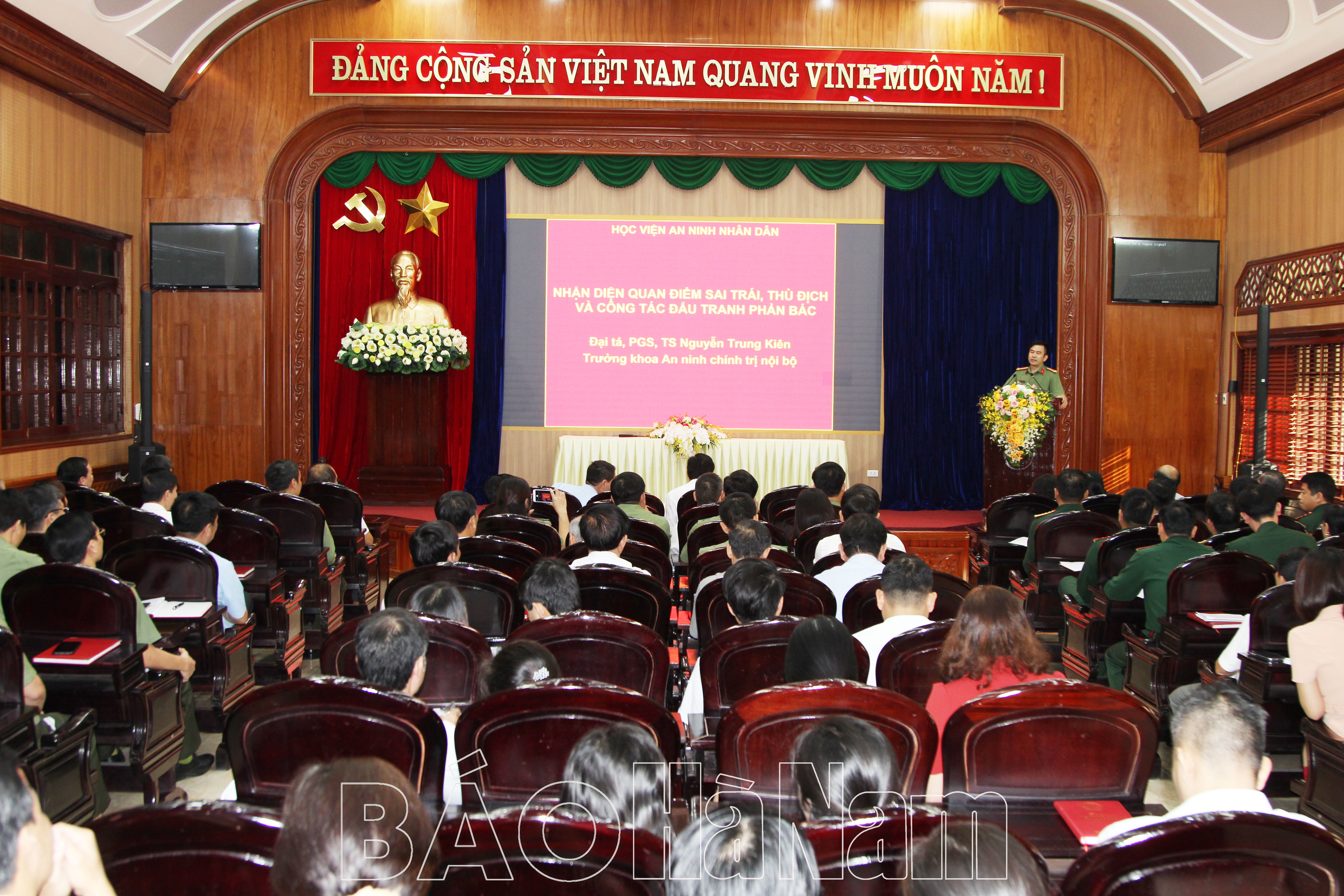 Tại buổi tập huấn các đại biểu tham dự được nghe Đại tá, Phó Giáo sư, Tiến sỹ Nguyễn Trung Kiên, Trưởng Khoa An ninh chính trị nội bộ- Học viện An ninh truyền đạt nội dung về: Nhận diện quan điểm sai trái, thù địch và công tác đấu tranh phản bác. Trong đó, đi sâu phân tích quan điểm của Đảng, Nhà nước Việt Nam về các vấn đề trong nước và thế giới; nhận diện các quan điểm sai trái, thù địch trên các lĩnh vực văn học, nghệ thuật, báo chí…; vấn đề dân chủ, nhân quyền; nguyên nhân nảy sinh quan điểm sai trái, thù địch; tổ chức công tác phòng ngừa, đấu tranh với luận điệu sai trái…