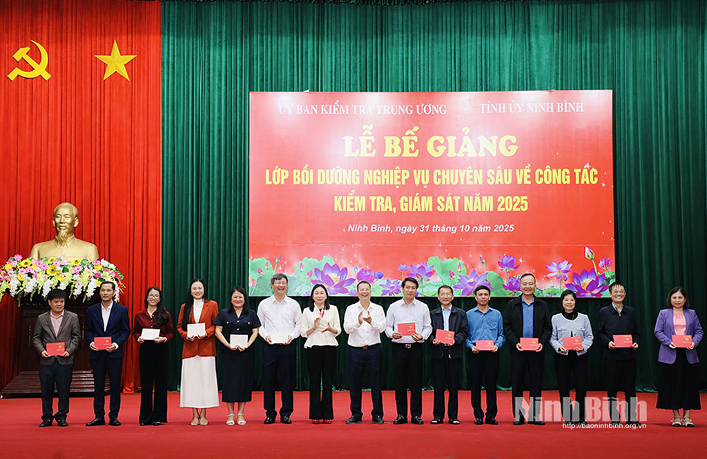 Chiều 31/10, Ủy ban Kiểm tra (UBKT) Trung ương phối hợp với Tỉnh ủy Ninh Bình tổ chức bế giảng Lớp bồi dưỡng nghiệp vụ chuyên sâu về công tác kiểm tra, giám sát năm 2025.