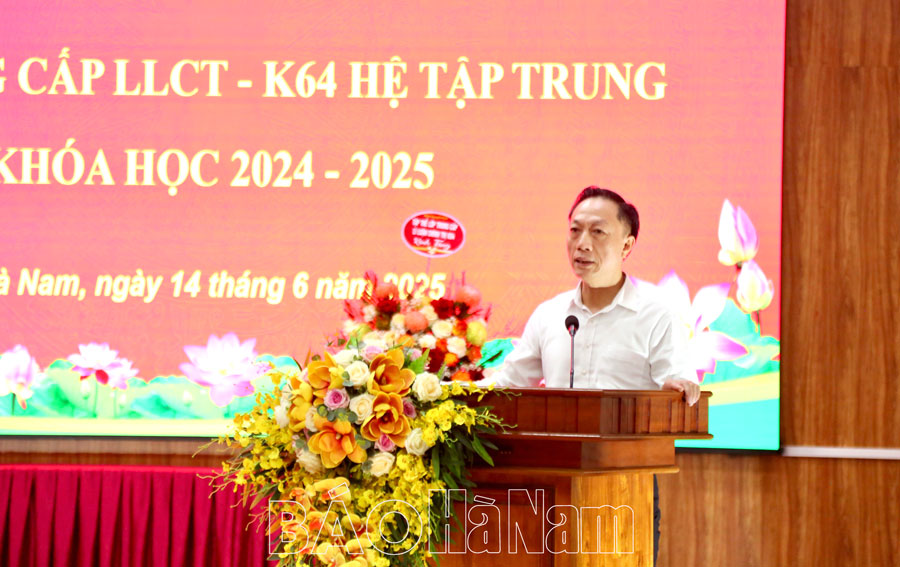Lãnh đạo Trường Chính trị tỉnh phát biểu tại lễ bế giảng và chúc mừng các học viên hoàn thành khóa học.