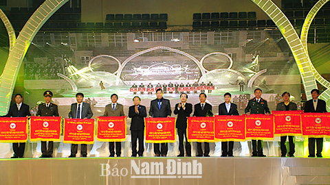 | Các đồng chí: Bộ trưởng Bộ VH, TT và DL Hoàng Tuấn Anh; Bí thư Tỉnh ủy Phạm Hồng Hà trao Cờ cho 10 đoàn thể thao đạt thành tích cao tại Đại hội TDTT toàn quốc lần thứ VII-2014. |