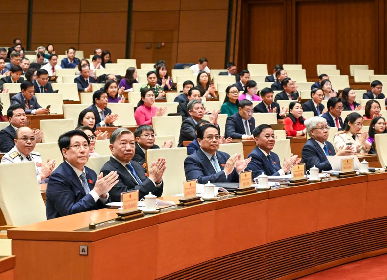 | Các đồng chí lãnh đạo Đảng, Nhà nước dự phiên bế mạc Kỳ họp thứ 8, Quốc hội khóa XV. (Ảnh: DUY LINH) |