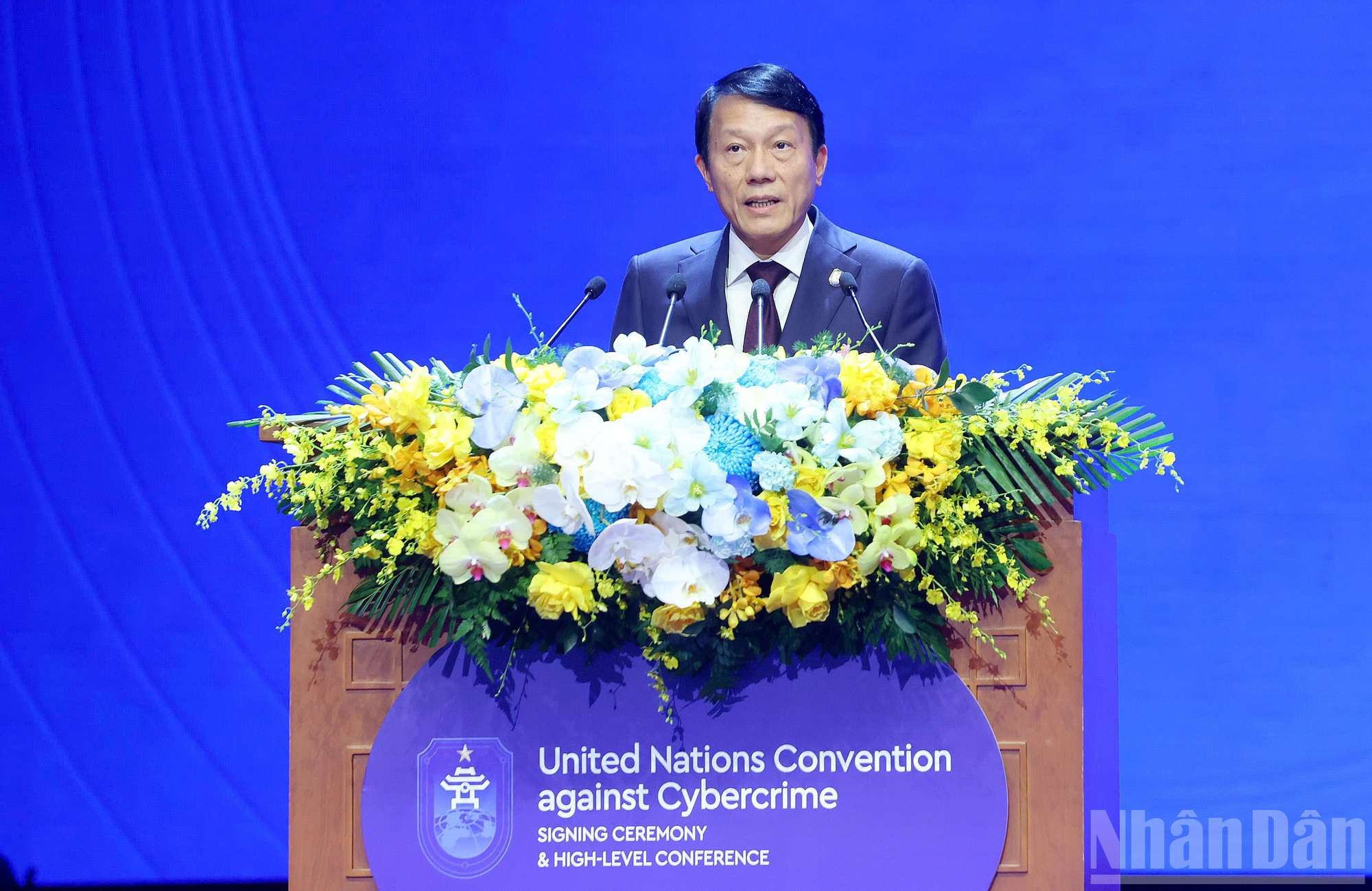 Bộ trưởng Công an Lương Tam Quang phát biểu bế mạc Lễ mở ký Công ước Hà Nội. (Ảnh: THỦY NGUYÊN)