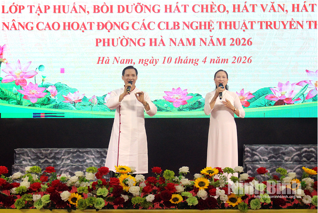 Chiều 10/4, Trung tâm Văn hoá tỉnh Ninh Bình phối hợp với UBND phường Hà Nam tổ chức bế mạc lớp tập huấn, bồi dưỡng hát Chèo, hát Văn, hát Xẩm, nâng cao chất lượng các CLB nghệ thuật truyền thống. Tham dự bế mạc có lãnh đạo Trung tâm Văn hoá tỉnh; phường Hà Nam và hơn 40 học viên là hạt nhân của các câu lạc bộ nghệ thuật truyền thống trên địa bàn phường.