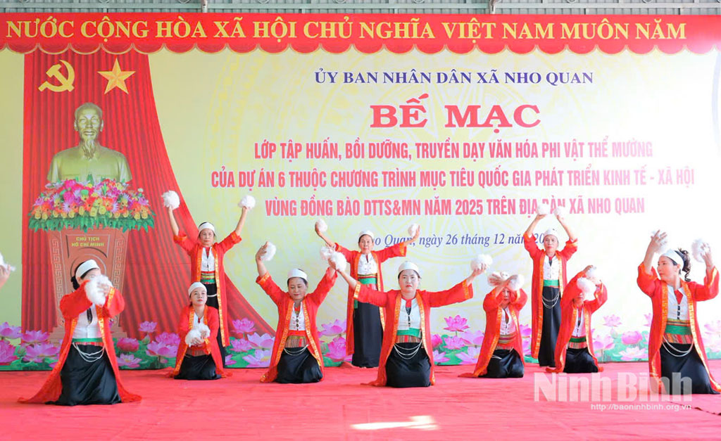 Lớp tập huấn, bồi dưỡng, truyền dạy văn hóa phi vật thể Mường diễn ra từ ngày 17- 22/12/2025 với các chuyên đề: Tổng quan văn hóa phi vật thể của dân tộc Mường tỉnh Ninh Bình; xây dựng sản phẩm du lịch cộng đồng dựa vào nguồn lực văn hóa vùng đồng bào dân tộc thiểu số; thực hành kỹ năng hát Mường, múa cổ truyền, sử dụng nhạc cụ, nhạc khí…