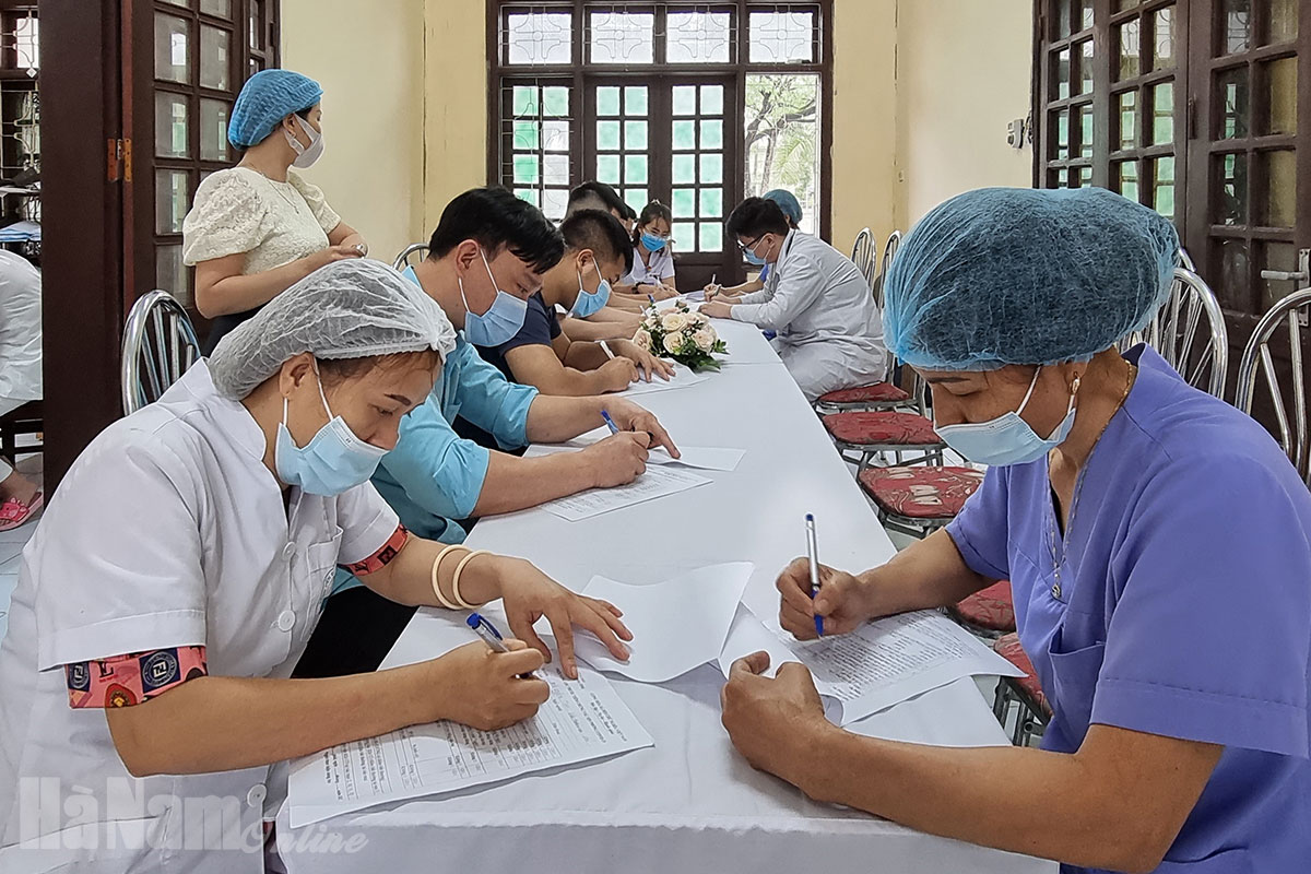 Cán bộ y tế BVĐK tỉnh khai hồ sơ và viết cam kết tiêm vắc-xin phòng Covid-19.