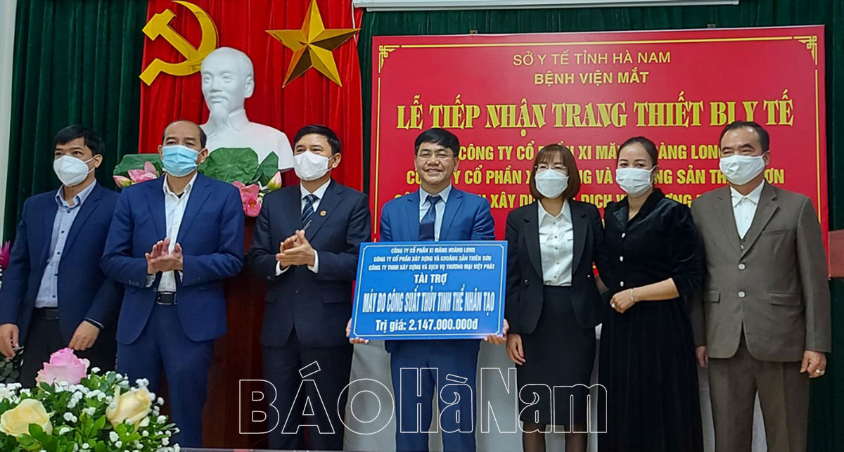 Sáng ngày 19/1, Bệnh viện Mắt Hà Nam đã tổ chức lễ tiếp nhận trang thiết bị y tế do 3 doanh nghiệp tài trợ gồm: Công ty CP xi măng Hoàng Long, Công ty CP Xây dựng và Khoáng sản Thiên Sơn, Công ty TNHH Xây dựng và Dịch vụ thương mại Việt Phát.