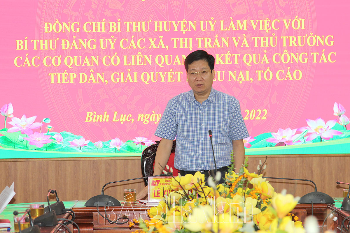 Kết luận hội nghị, đồng chí Lê Xuân Huy, Ủy viên Ban Chấp hành Đảng bộ tỉnh, Bí thư Huyện ủy, Chủ tịch HĐND huyện đánh giá: Bình Lục thời gian qua các vụ việc cơ bản đều được giải quyết ngay tại cơ sở, tuy nhiên địa phương vẫn có những tồn tại, hạn chế nhất định. Bên cạnh đó, trong quá trình phát triển KT-XH của địa phương cũng sẽ nảy sinh những vấn đề phức tạp. Do vậy, yêu cầu: Trước hết, người đứng đầu cấp ủy, chính quyền các đơn vị, địa phương phải quán triệt thực hiện đầy đủ chủ trương, chính sách pháp luật, phát huy vai trò, trách nhiệm của bản thân trong công tác tiếp dân, giải quyết KNTC, công khai lịch tiếp công dân; quá trình tiếp công dân phải thực hiện đúng các bước theo quy định. Đặc biệt, người đứng đầu cấp ủy, chính quyền, các ban, ngành, đoàn thể trong huyện phải chủ động phối hợp, nắm tình hình cơ sở, nắm bắt kịp thời yêu cầu, nguyện vọng của nhân dân, các vụ việc phát sinh, dự báo tình hình, tăng cường đối thoại, tiếp công dân, giải quyết các vụ việc ngay từ cơ sở, không để đơn thư KNTC vượt cấp.