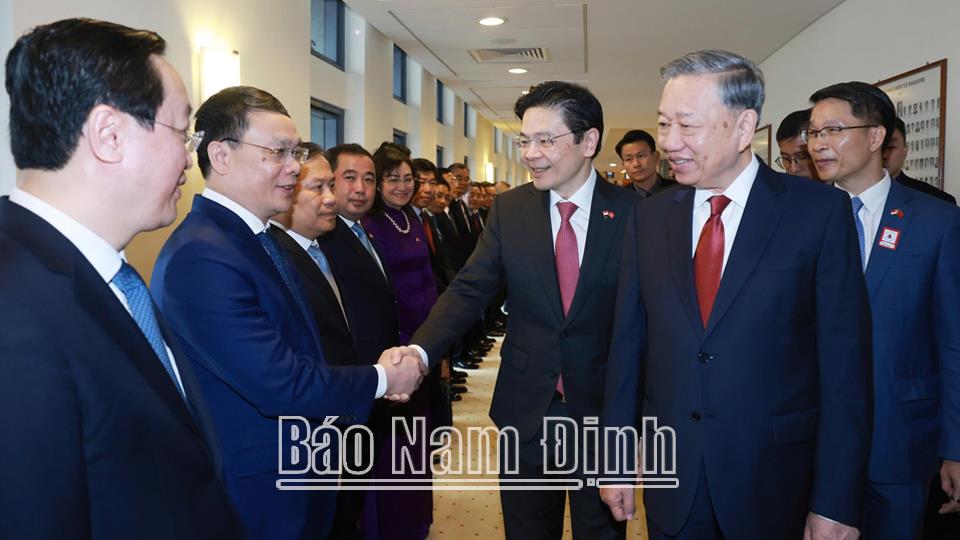 Kết thúc hội đàm, dưới sự chứng kiến của Tổng Bí thư Tô Lâm và Thủ tướng Singapore, Tổng Thư ký Đảng Hành động Nhân dân Singapore (PAP) Lawrence Wong, đồng chí Bí thư Tỉnh ủy Nam Định Đặng Khánh Toàn đã trao Quyết định chấp thuận chủ trương đầu tư dự án xây dựng và kinh doanh kết cấu hạ tầng KCN Hải Long (VSIP Nam Định) giai đoạn 1 cho chủ đầu tư dự án.