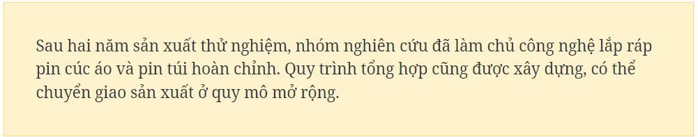 Sau hai năm sản xuất thử nghiệm, nhóm nghiên cứu đã làm chủ công nghệ lắp ráp pin cúc áo và pin túi hoàn chỉnh. Quy trình tổng hợp cũng được xây dựng, có thể chuyển giao sản xuất ở quy mô mở rộng.