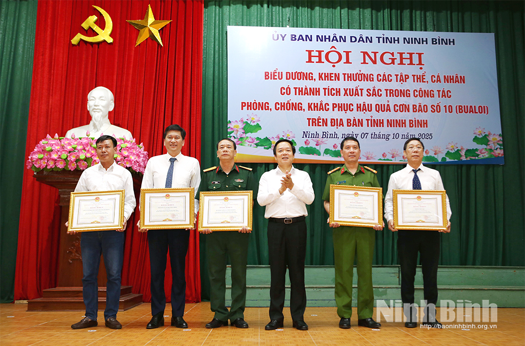 Tại hội nghị, đồng chí Chủ tịch UBND tỉnh Phạm Quang Ngọc đã trao tặng Bằng khen cho 7 tập thể, 9 cá nhân có thành tích xuất sắc trong công tác ứng phó, khắc phục hậu quả bão số 10 (Bão Bualoi).