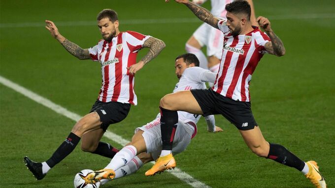 Real nhập cuộc với đội hình mạnh nhất có thể, nhưng Bilbao đã không cho nhà vô địch La Liga kịp tìm nhịp thi đấu. Phút 18, tận dụng đường chuyền hỏng của Lucas Vazquez, Dani Garcia chọc khe cho Raul Garcia băng xuống đánh bại Thibaut Courtois trong thế đối mặt.