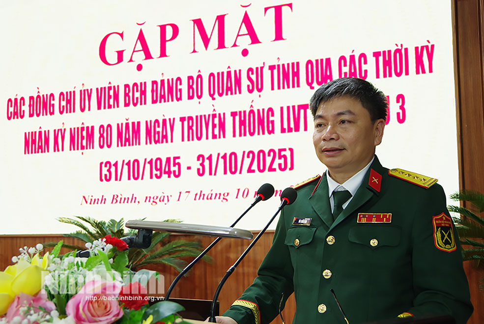 Sáng 17/10, tại Ban Chỉ huy Phòng thủ khu vực 1 - Phù Vân, Bộ Chỉ huy Quân sự (CHQS) tỉnh Ninh Bình tổ chức hội nghị gặp mặt các đồng chí Ủy viên Ban Chấp hành Đảng bộ Quân sự tỉnh qua các thời kỳ. Sự kiện được tổ chức nhân kỷ niệm 80 năm Ngày truyền thống lực lượng vũ trang (LLVT) Quân khu 3 (31/10/1945 - 31/10/2025).