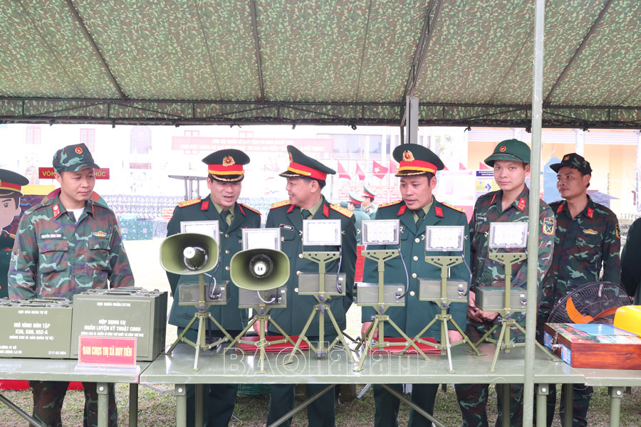 Lãnh đạo Bộ CHQS tỉnh và các đơn vị thảo luận, đánh giá mô hình học cụ huấn luyện năm 2025.Tham quan, chấm điểm sáng kiến mới của Trung đoàn bộ binh 151 (Bộ CHQS tỉnh).