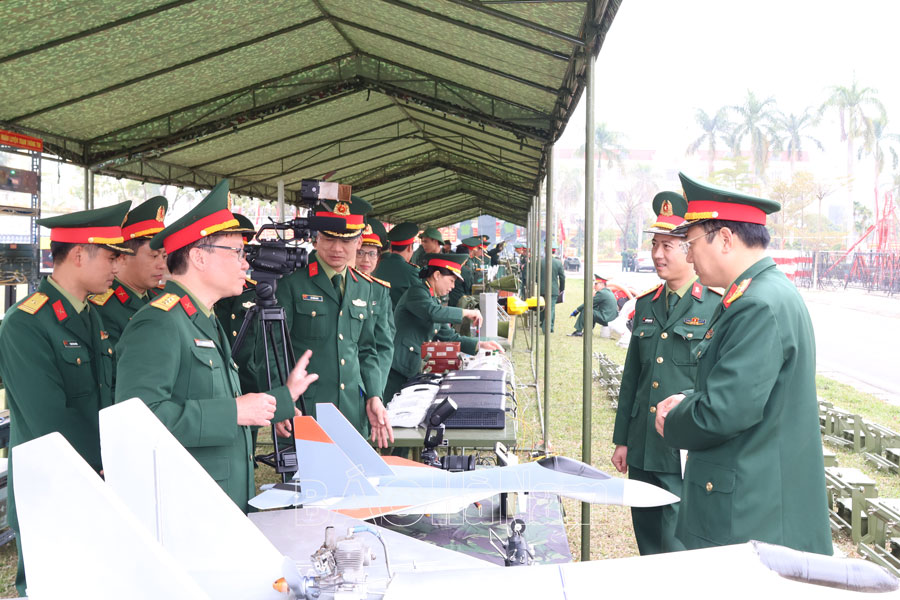 Lãnh đạo Bộ CHQS tỉnh và các đơn vị tham quan, chấm điểm mô hình học cụ huấn luyện.