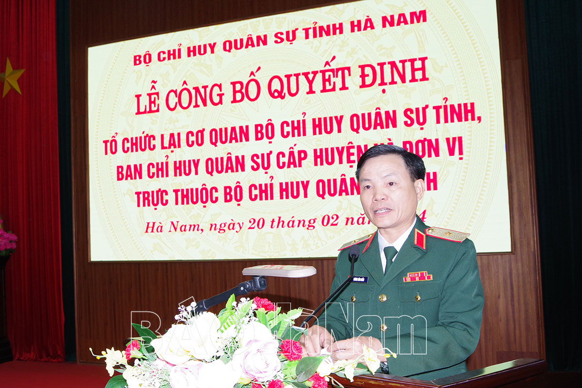 Tại hội nghị, Đại tá Trịnh Hồng Phong, Phó Bí thư ĐUQS tỉnh, Chỉ huy trưởng Bộ CHQS tỉnh công bố quyết định của Bộ trưởng Bộ Quốc phòng về việc tổ chức lại cơ quan Bộ CHQS cấp tỉnh, Ban CHQS cấp huyện và đơn vị trực thuộc Bộ CHQS cấp tỉnh.
