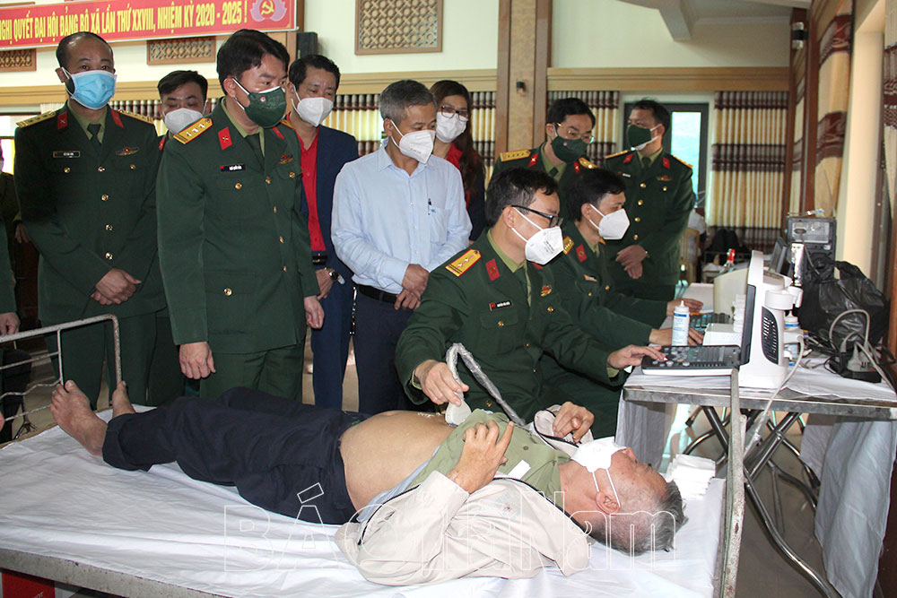 Lãnh đạo Bộ CHQS tỉnh thăm hỏi, động viên, tặng thuốc miễn phí cho người dân thuộc đối tượng chính sách.Siêu âm kiểm tra sức khỏe cho một thương bình.