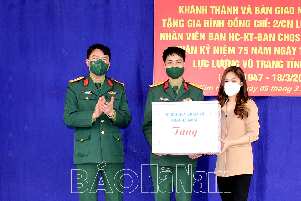 Cũng trong dịp này, Bộ CHQS tỉnh đã tổ chức khánh thành, bàn giao “Nhà đồng đội” tặng gia đình Trung úy Quân nhân chuyên nghiệp Lương Văn Thành (xã Thụy Lôi, huyện Kim Bảng, nhân viên Ban Hậu cần- Kỹ thuật, cơ quan Ban CHQS huyện Kim Bảng, hoàn cảnh khó khăn về nhà ở).