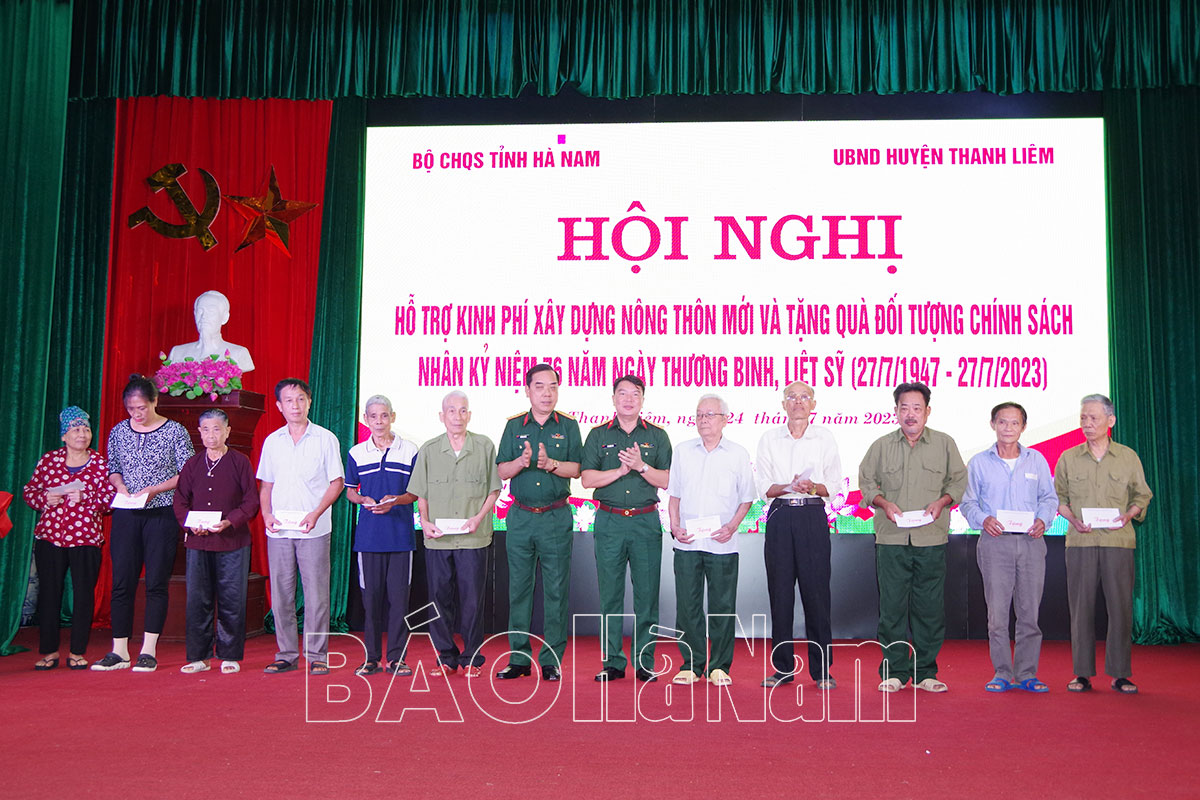 Sáng 24/7, Bộ CHQS tỉnh phối hợp với UBND huyện Thanh Liêm tổ chức hội nghị trao kinh phí hỗ trợ xây dựng nông thôn mới và tặng quà đối tượng chính sách trên địa bàn xã Thanh Nghị. Dự hội nghị có các đồng chí Đinh Thị Lụa, Phó Bí thư thường trực Tỉnh uỷ; Đại tá Lường Văn Thắng, Uỷ viên BTV Tỉnh uỷ, Chỉ huy trưởng Bộ CHQS tỉnh, Thượng tá Ngô Quốc Bảo, Chính uỷ Bộ CHQS tỉnh; lãnh đạo UBND huyện Thanh Liêm; các doanh nghiệp tài trợ.