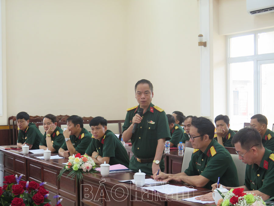 Cán bộ, sĩ quan Ban CHQS thị xã Duy Tiên nêu ý kiến kiến nghị tại hội nghị.
