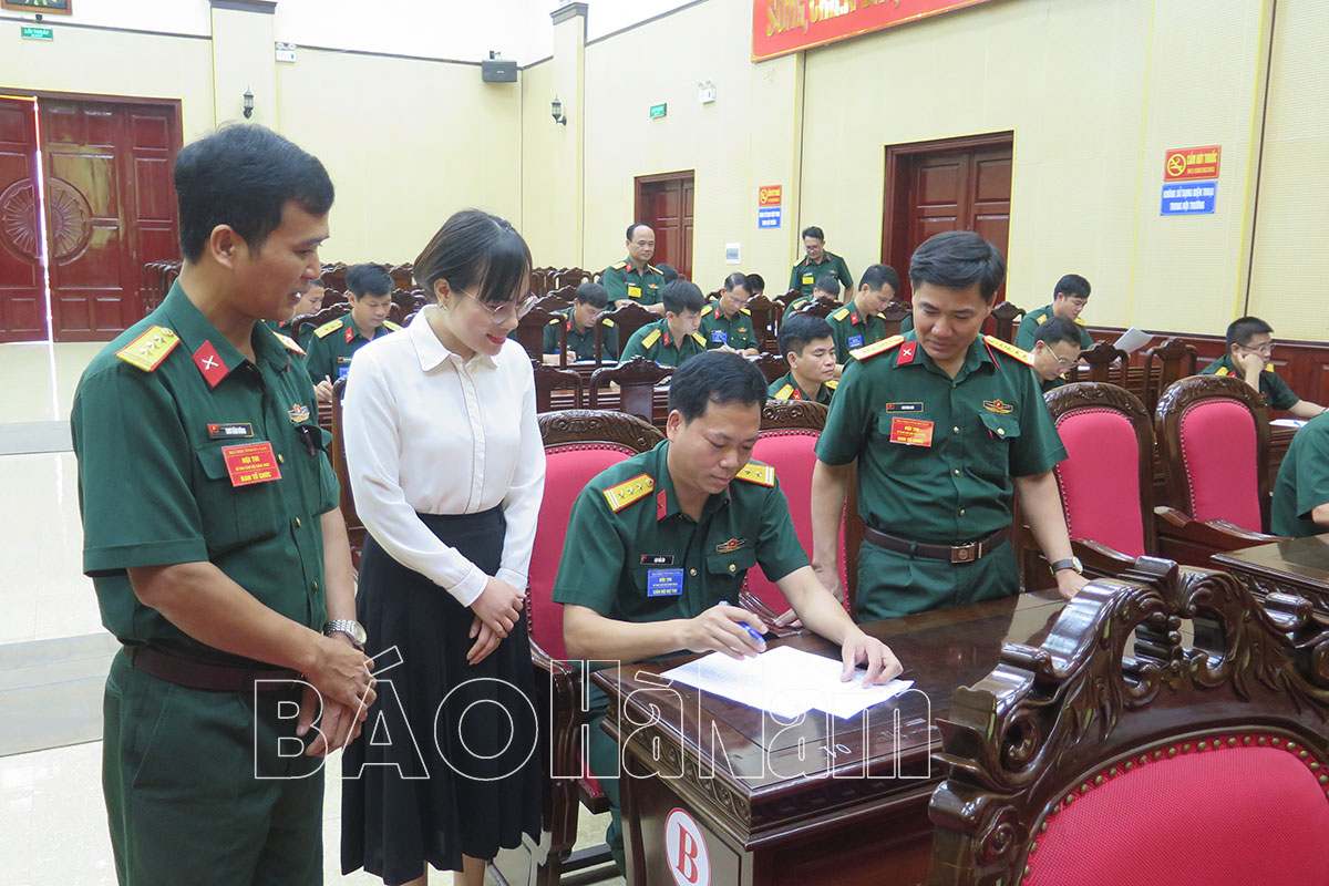 Đại tá Trịnh Hồng Phong, Phó Chỉ huy trưởng kiêm Tham mưu trưởng Bộ CHQS tỉnh phát biểu khai mạc hội thi.Các cán bộ dự thi tham gia phần thi nhận thức bằng hình thức trắc nghiệm.