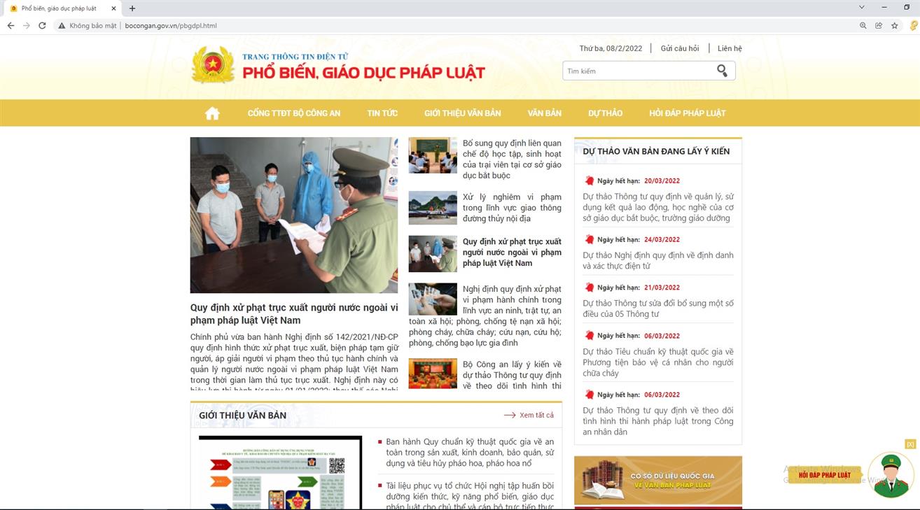 Ngày 11/2, Bộ Công an chính thức ra mắt Trang Thông tin điện tử phổ biến, giáo dục pháp luật của Bộ Công an là Trang thành phần thuộc Cổng Thông tin điện tử Bộ Công an, có địa chỉ: http://bocongan.gov.vn/pbgdpl.html, với giao diện kết hợp một số tính năng ứng dụng tiên tiến, đáp ứng nhu cầu của Chiến lược Chính phủ điện tử trong thời kỳ mới.