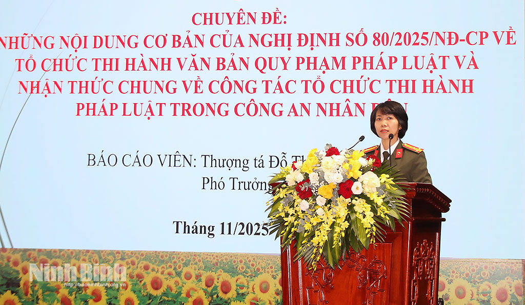 Sáng 13/11, tại Công an tỉnh Ninh Bình, Bộ Công an tổ chức hội nghị tập huấn nâng cao hiệu quả công tác tổ chức thi hành pháp luật trong Công an nhân dân và kỹ năng, nghiệp vụ pháp luật về xử lý vi phạm hành chính cho lực lượng công an của 15 tỉnh, thành khu vực phía Bắc.