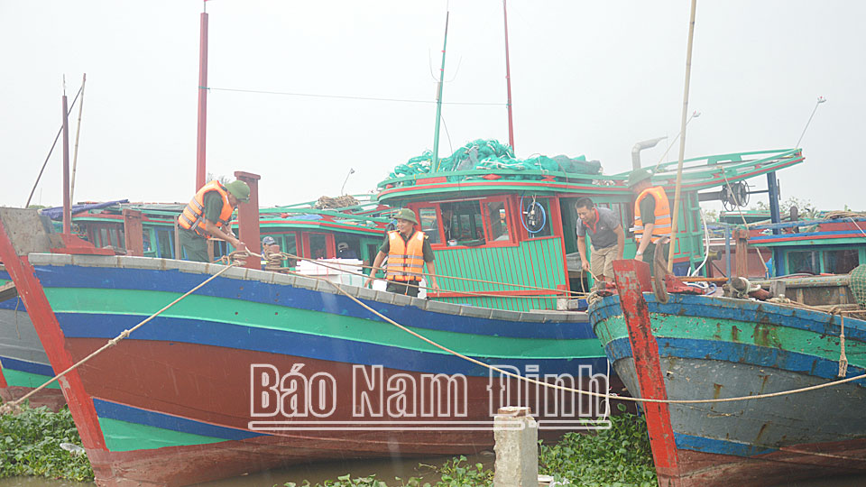| Cán bộ, chiến sĩ BĐBP tỉnh giúp ngư dân neo đậu tàu thuyền phòng, chống bão số 3 (YAGI). |