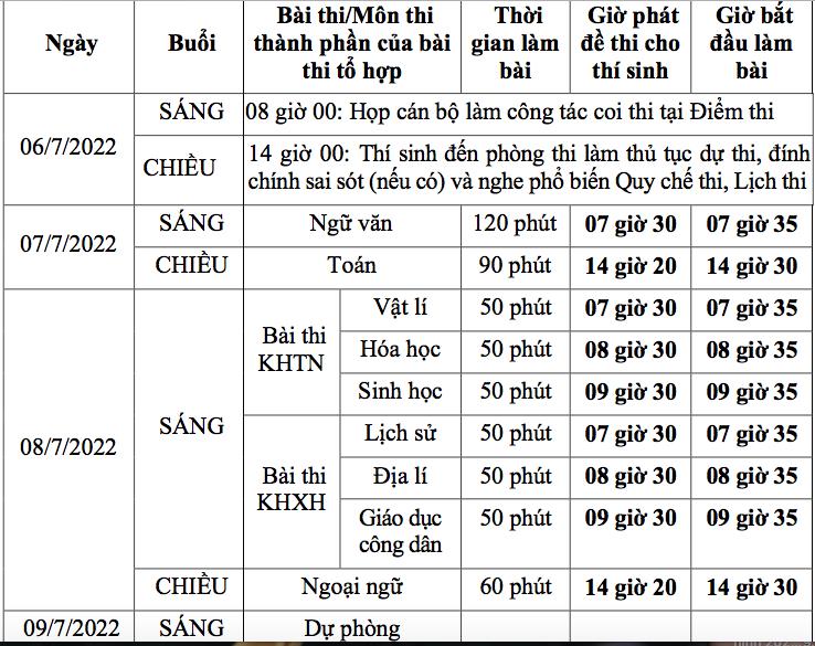 Cụ thể: Sáng 7/7, thí sinh dự thi môn Ngữ Văn; chiều 7/7, thí sinh dự thi môn Toán; sáng 8/7, thí sinh dự thi bài thi Khoa học Tự nhiên và bài thi Khoa học Xã hội; chiều 8/7, thí sinh dự thi môn Ngoại ngữ.