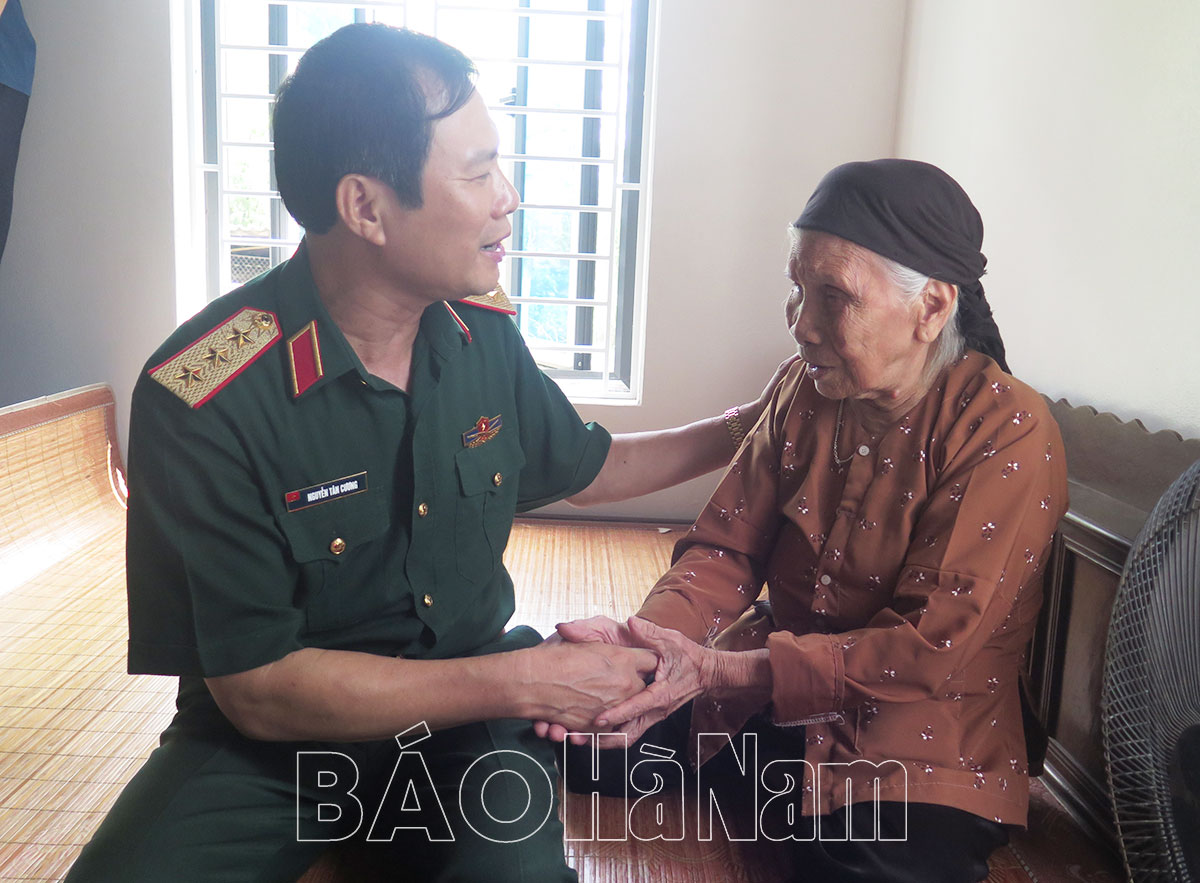Thượng tướng Nguyễn Tân Cương, Tổng Tham mưu trưởng Quân đội nhân dân Việt Nam ân cần thăm hỏi sức khỏe bà Ngô Thị Tho (mẹ liệt sĩ Đặng Văn Chiều) dịp kỷ niệm 27/7 vừa qua.