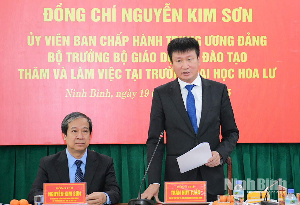 Phát biểu tại buổi làm việc, đồng chí Chủ tịch UBND tỉnh Trần Huy Tuấn trân trọng cảm ơn đồng chí Bộ trưởng và Đoàn công tác của Bộ Giáo dục và Đào tạo đã về thăm, làm việc với Trường Đại học Hoa Lư. Đồng chí Chủ tịch UBND tỉnh tiếp thu toàn bộ ý kiến chỉ đạo của đồng chí Bộ trưởng Bộ Giáo dục và Đào tạo, thời gian tới, tỉnh tiếp tục quan tâm đầu tư nguồn lực về cơ sở vật chất đồng bộ, hiện đại; nghiên cứu cơ chế khuyến khích, thu hút nguồn nhân lực chất lượng cao là cán bộ, giáo viên và học sinh, sinh viên về công tác, giảng dạy, học tập tại Trường;… Bên cạnh đó, đồng chí Chủ tịch UBND tỉnh yêu cầu Trường Đại học Hoa Lư tiếp tục rà soát, nghiên cứu, xác định rõ định hướng phát triển dài hạn theo định hướng của Bộ Giáo dục và Đào tạo, Nghị quyết Đại hội Đảng bộ tỉnh lần thứ nhất, nhiệm kỳ 2025-2030 và các định hướng phát triển giáo dục đại học của tỉnh; phát huy tối đa tiềm năng, thế mạnh để nâng cao năng lực cạnh tranh trong đào tạo các ngành nghề hệ sư phạm, ngoài các ngành sư phạm truyền thống, mở rộng sang đào tạo giáo viên với các môn học đang cần như: Tin học, Mỹ thuật…; đẩy mạnh nghiên cứu khoa học, không ngừng nâng cao chất lượng giáo dục để xây dựng, phát triển Trường Đại học Hoa Lư xứng đáng là cơ sở đào tạo nguồn nhân lực chất lượng cao cho tỉnh và đất nước.