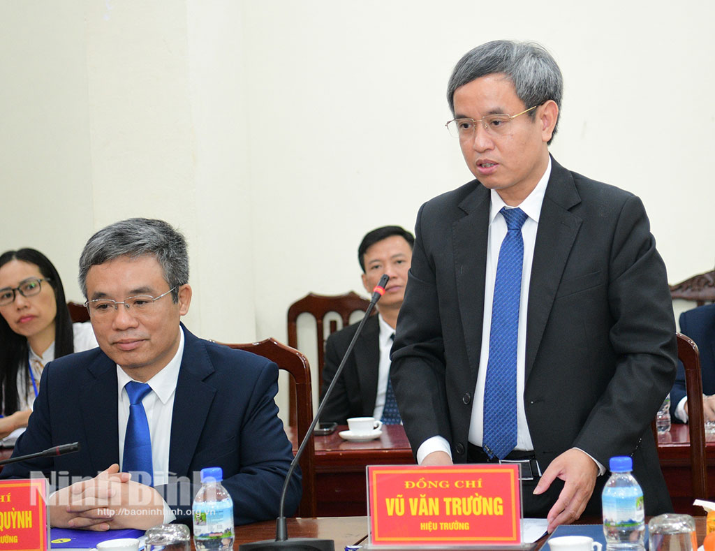 Đồng chí Vũ Văn Trường, Hiệu trưởng Trường Đại học Hoa Lư báo cáo kết quả hoạt động của nhà trường tại buổi làm việc.
