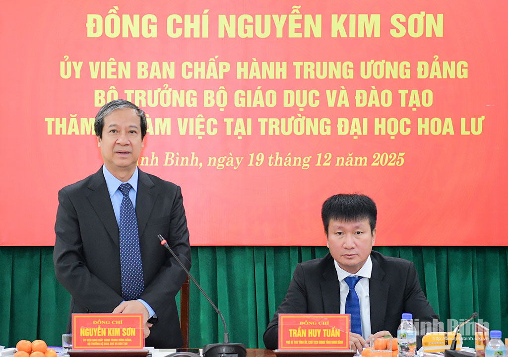 Phát biểu tại buổi làm việc, Bộ trưởng Bộ Giáo dục và Đào tạo Nguyễn Kim Sơn chúc mừng, biểu dương những thành tích mà thầy và trò Trường Đại học Hoa Lư đã đạt được trong thời gian qua. Bên cạnh những kết quả đã đạt được, đồng chí Bộ trưởng yêu cầu: trong giai đoạn mới, Trường Đại học Hoa Lư cần xác định rõ tầm nhìn, sứ mệnh để tiếp tục phát triển bền vững trong tương lai. Trên cơ sở đó, Trường Đại học Hoa Lư cần lập kế hoạch phát triển trong giai đoạn 5 năm tới; trong đó, xác định củng cố, nâng cao chất lượng khối ngành đào tạo sư phạm, chú ý mở rộng phạm vi tuyển sinh không chỉ trong tỉnh mà cả các tỉnh khác. Bên cạnh khối ngành sư phạm, yêu cầu Trường hướng tới mở rộng ngành nghề đào tạo nguồn nhân lực chất lượng cao về nhóm ngành công nghệ và kỹ thuật theo định hướng của tỉnh, của Sở Giáo dục và Đào tạo để phát triển theo hướng đa ngành… Tuy nhiên, Trường Đại học Hoa Lư tiếp tục có điều kiện phát triển, đáp ứng tốt các yêu cầu về đào tạo nguồn nhân lực chất lượng cao, đáp ứng thực hiện các nhiệm vụ phát triển kinh tế-xã hội của tỉnh, đồng chí Bộ trưởng đề nghị tỉnh tiếp tục quan tâm, hỗ trợ Trường Đại học Hoa Lư về đầu tư cơ sở vật chất đồng bộ, hiện đại; có cơ chế, chính sách thu hút, đãi ngộ cao đối với đội ngũ cán bộ, giảng viên và có cơ chế hỗ trợ học bổng để thu hút người học…