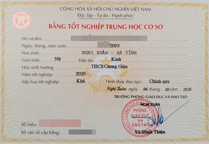 Bằng tốt nghiệp THCS của học sinh năm 2020, dòng cuối có ghi xếp loại tốt nghiệp.