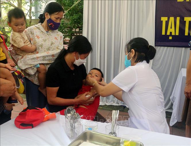 Cho trẻ uống Vitamin A tại xã Phù Vân, thành phố Phủ Lý.