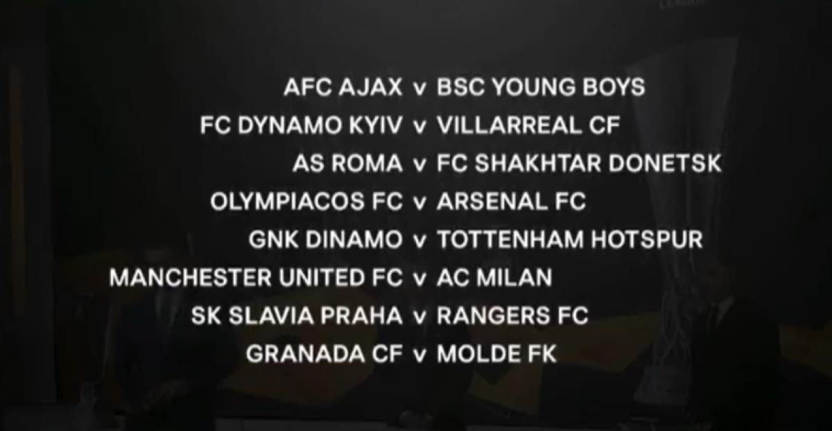 Ở các cặp đấu còn lại, Ajax đối đầu Young Boys, Villarreal gặp Dinamo Kiev, AS Roma chạm trán Shakhtar, Rangers gặp Slavia Praha còn Molde sẽ bắt cặp với đối thủ Granada.