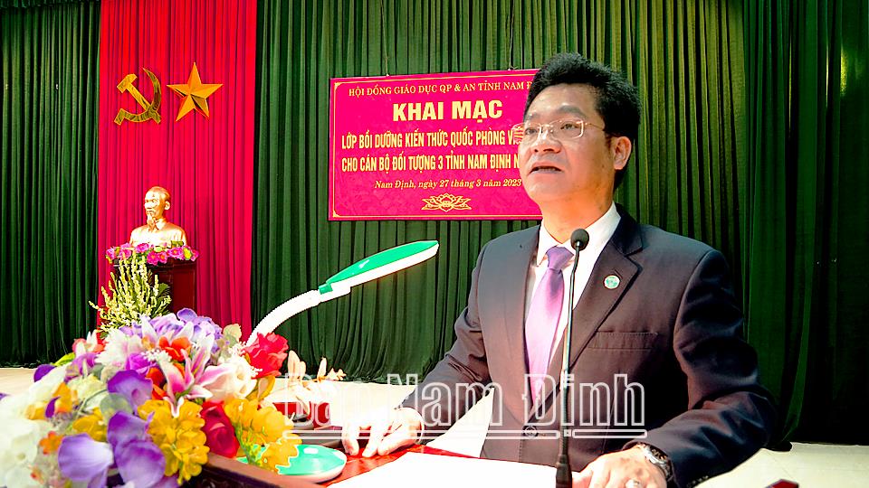Ngày 27-3, tại Trung đoàn 180, Hội đồng Giáo dục quốc phòng và an ninh (QPAN) tỉnh tổ chức khai giảng lớp bồi dưỡng kiến thức QPAN năm 2023 cho 80 cán bộ thuộc đối tượng 3 là trưởng, phó phòng các sở, ban, ngành, đoàn thể, các trường cao đẳng, đại học trên địa bàn tỉnh. Đồng chí Trần Anh Dũng, Ủy viên Ban TVTU, Phó Chủ tịch Thường trực UBND tỉnh, Chủ tịch Hội đồng Giáo dục QPAN tỉnh đến dự.